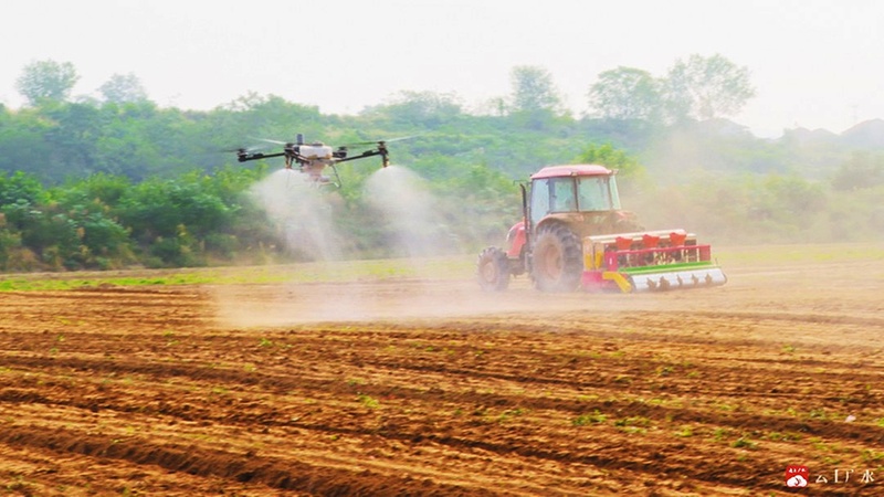 金秋时节,正是播种的好时节。在广水街道南山村油菜高产高效示范点,耕耘者奔赴田间地头,高效完成旋耕、起垄、施肥任务。植检无人机升上天空,将喷洒的杀虫剂均匀地撒在土壤表面。现场充满了机器和忙碌的人们。